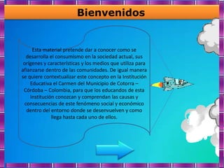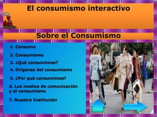Este documento busca explicar el concepto de consumismo, sus orígenes y características, así como analizar su impacto en la sociedad actual. Define el consumo y diferencia el consumismo, examinando factores como la publicidad, el origen de la sociedad de consumo y los efectos negativos del consumismo excesivo en las personas y el medio ambiente. Finalmente, propone actividades para que los estudiantes analicen de forma crítica este fenómeno social.