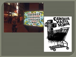 Este documento describe la evolución de la sociedad de consumo en España desde los años 20 hasta la actualidad. Comenzó como un consumo de élites en las décadas de 1920 y 1960, se extendió como un consumo de masas, y más recientemente ha evolucionado hacia un consumo personalizado. Las estrategias de marketing y publicidad juegan un papel clave en la creación de deseos de consumo y la definición de las marcas.