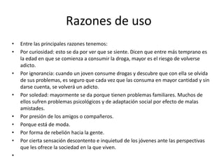 Las principales razones para el consumo de drogas incluyen la curiosidad, la ignorancia, la soledad y la presión de los amigos. El consumo de drogas conlleva graves consecuencias físicas y psicológicas para los adolescentes y repercusiones importantes para sus familias. Los peligros individuales incluyen baja autoestima y falta de metas, mientras que los peligros familiares derivan de padres punitivos, permisivos o con falta de comunicación.