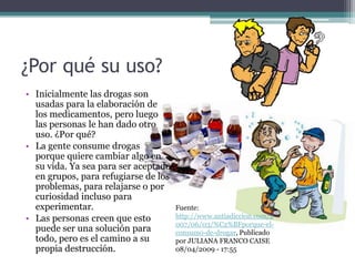 El documento trata sobre el consumo de drogas. Explica que inicialmente las drogas se usaban para medicamentos, pero luego las personas encontraron otros usos, como cambiar algo en su vida, ser aceptados socialmente, refugiarse de problemas o por curiosidad. Sin embargo, el consumo de drogas conduce a la destrucción personal y tiene graves consecuencias como depresión, cambios de humor, locura, daños al sistema nervioso y enfermedades como hepatitis, SIDA, cáncer y daños al cerebro y corazón.