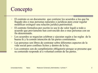 El documento explica el concepto de contrato, sus partes, tipos y ejemplos. Un contrato es un acuerdo escrito entre dos o más partes para crear, modificar o extinguir una relación jurídica patrimonial de forma lícita y de común acuerdo. Un contrato contiene cláusulas, partes, fecha y firmas. Existen contratos nominales y atípicos para diferentes fines como compraventa, arriendo, donación, entre otros.