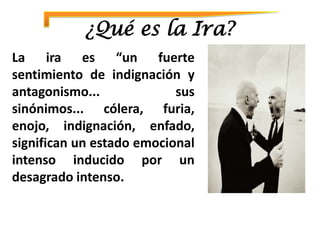 Este documento trata sobre la ira, explicando que es una emoción intensa causada por sentimientos de amenaza, frustración o error. Aunque comúnmente se cree que la ira es causada por factores externos y que no se puede controlar, la realidad es que uno es responsable de sus propios sentimientos de ira y la forma en que los maneja. El documento también discute mitos sobre la ira, como que expresarla siempre es saludable o que las únicas opciones son expresarla o guardarla, cuando en realidad se puede rechazar