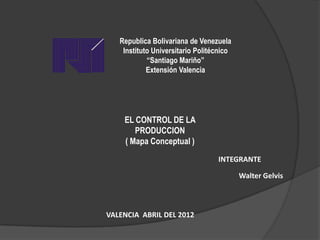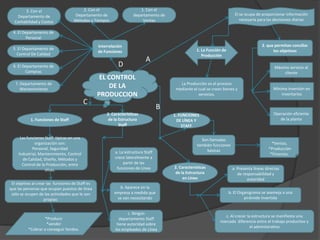 Este documento presenta un mapa conceptual sobre el control de la producción. Explica que el control de la producción involucra 7 departamentos (contabilidad y costos, métodos y tiempos, ventas, personal, control de calidad, compras, mantenimiento) que interactúan para lograr la máxima eficiencia y servicio al cliente con una inversión mínima. También describe las funciones de línea y staff, y las características de sus estructuras organizacionales.