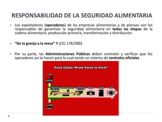 Este documento describe los mecanismos de control oficial en la industria láctea en España. Establece que los operadores son responsables de garantizar la seguridad alimentaria y que las administraciones públicas deben controlar y verificar el cumplimiento a través de controles oficiales. Detalla los niveles y objetivos de control, así como los requisitos para la toma de muestras, análisis y etiquetado en los centros lácteos para garantizar la calidad e inocuidad de la leche.