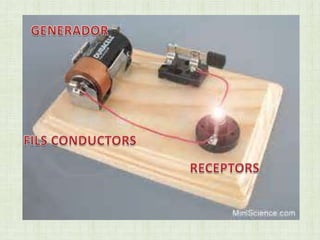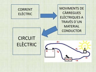 El documento describe los elementos básicos de un circuito eléctrico, incluyendo la generación de corriente eléctrica a través del movimiento de cargas eléctricas en un material conductor, así como los elementos conductores y receptores que permiten que la electricidad fluya en el circuito y sea utilizada para convertirla en otros tipos de energía como luz, calor o movimiento.
