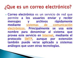 El correo electrónico permite a los usuarios enviar y recibir mensajes y archivos rápidamente a través de sistemas de comunicación electrónicos. Para enviar y recibir correo electrónico, una persona debe tener una dirección de correo electrónico única proporcionada por un proveedor de correo. Existen dos tipos de proveedores de correo: los gratuitos que incluyen publicidad, y los de pago que normalmente ofrecen todos los servicios disponibles.
