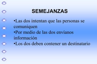 El documento compara el correo electrónico y el correo postal, señalando que ambos permiten la comunicación y envío de información a destinatarios, pero que el correo electrónico es más rápido y permite enviar a múltiples destinatarios, mientras que el correo postal solo envía a uno y no usa internet.