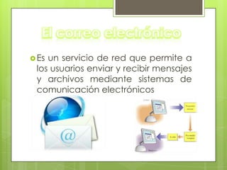 El correo electrónico es un servicio de red que permite a los usuarios enviar y recibir mensajes y archivos mediante sistemas de comunicación electrónicos. Los usuarios pueden redactar mensajes indicando el destinatario, asunto y mensaje, y estos se archivan en un buzón de correo asociado a una dirección de correo electrónico única. El correo electrónico contiene un encabezado con información sobre el mensaje y un cuerpo con el contenido del mensaje.
