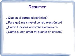 El documento proporciona información sobre el correo electrónico. Explica que el correo electrónico permite compartir texto y archivos digitales a través de Internet. Detalla que los usuarios necesitan una cuenta con un proveedor de correo electrónico, la cual requiere un nombre de usuario y contraseña. Además, describe el proceso de envío de correos electrónicos entre usuarios a través de servidores de correo electrónico.