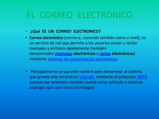 El documento describe el correo electrónico y las redes sociales. Define el correo electrónico como un servicio que permite enviar y recibir mensajes y archivos rápidamente a través de sistemas electrónicos de comunicación. Explica que un correo electrónico tiene tres partes: el encabezado, el cuerpo del mensaje y los campos del encabezado. También describe las características y funciones de las redes sociales, incluidas las interacciones basadas en usuarios, el intercambio de información e intereses, y la provisión de comp