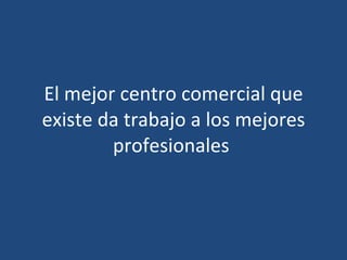 El documento presenta a los mejores profesionales que trabajan en el mejor centro comercial, describiendo sus cualidades de forma positiva a través de adjetivos como hábil, amable, eficiente y culto. También recomienda visitar otros centros comerciales similares.