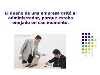 El documento describe cómo el enojo y la ira se propagaron entre varias personas de manera circular, desde un jefe enojado hasta una empleada, un perro, una señora y un médico joven. Sin embargo, el círculo del odio se interrumpió cuando la madre del médico lo trató con tolerancia, perdón y amor en lugar de enojo, ayudándolo a calmarse. El documento sugiere romper círculos de odio a través de la compasión en lugar de propagar más enojo.