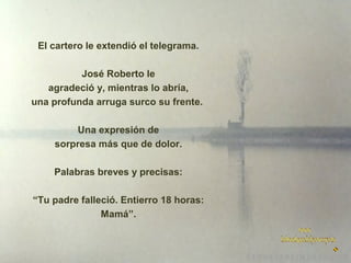 José Roberto recibe un telegrama informándole sobre la muerte de su padre, con quien tenía una relación tensa. A medida que lee un cuaderno dejado por su padre, descubre el amor y el sacrificio que hubo detrás de su dureza, lo que lo lleva a reflexionar sobre su propia paternidad y la conexión con su padre. Finalmente, siente una mezcla de dolor y gratitud, deseando haber comprendido antes el valor de su padre y la importancia de amar y apreciar a los seres queridos.