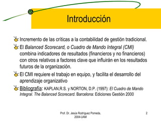 El documento describe el Cuadro de Mando Integral (CMI) como un sistema de gestión estratégica que combina indicadores financieros y no financieros para traducir la visión y estrategia de una empresa en objetivos medibles. El CMI contempla la empresa desde cuatro perspectivas: financiera, del cliente, de los procesos internos y del aprendizaje y crecimiento. Ayuda a comunicar y alinear objetivos, y a proporcionar retroalimentación para mejorar el aprendizaje estratégico.