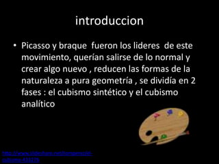 El movimiento del Cubismo fue liderado por Picasso y Braque a principios del siglo XX. Querían alejarse de las formas naturales y crear algo nuevo, dividiendo las formas de la naturaleza en pura geometría. El Cubismo pasó por dos fases: el Cubismo sintético, en el que se usaban colores apagados y diferentes puntos de vista geométricos, y el Cubismo analítico, caracterizado por el uso del collage y la representación de múltiples perspectivas en una sola imagen.