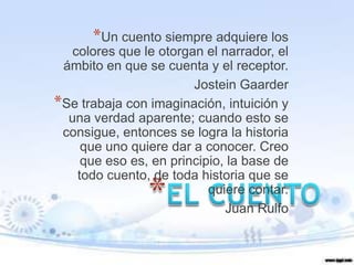 Este documento presenta una definición y características del cuento. Explica que el cuento es una narración breve de ficción con pocos personajes y argumento sencillo. Originalmente era transmitido oralmente pero ahora también se cuenta por escrito. Incluye ejemplos de diferentes tipos de cuentos como populares, literarios, de fantasía, de horror y realistas.