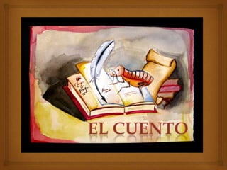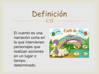 El documento define el cuento como una narración corta que involucra personajes realizando acciones en un lugar y tiempo específicos. Explica que la introducción presenta la época, lugar y personajes, el nudo desarrolla el problema y sus sucesos de resolución, y el desenlace concluye la historia y devuelve a la normalidad.