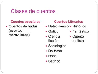Este documento clasifica los cuentos en dos grandes tipos: cuentos populares y cuentos literarios. Describe varios subtipos de cuentos literarios como el cuento detectivesco, gótico, de ciencia ficción, sociológico, de terror, romántico, fantástico e histórico. Para cada subtipo, brinda características y ejemplos de autores representativos.