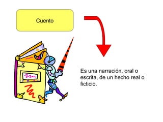 El documento proporciona una definición y características del cuento. Explica que el cuento es una narración breve que se caracteriza por la brevedad, tensión e intensidad. Describe los elementos clave de un cuento como la acción, atmósfera, ambiente y personajes. También explica la estructura típica de un cuento con la introducción, nudo y desenlace.