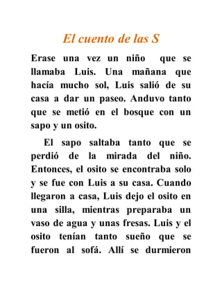 Un niño llamado Luis salió a dar un paseo por el bosque con un sapo y un osito. El sapo se perdió, así que el osito se quedó solo con Luis. Luis llevó al osito a su casa, donde comieron juntos y se hicieron amigos después de dormir una siesta en el sofá.