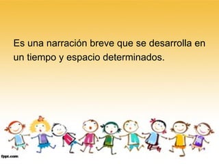 El documento define el cuento como una narración breve que se desarrolla en un tiempo y lugar específicos, e involucra personajes principales y secundarios que viven situaciones especiales. Explica que un cuento tiene una estructura con una presentación, un desarrollo de los hechos y problemas, y un final donde la situación se resuelve y el destino de los personajes se revela, usando palabras clave como "Hace mucho tiempo...", "Entonces...", y "Al final...".