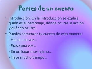 El documento describe las tres partes principales de un cuento: la introducción, que presenta al personaje, el lugar y el tiempo; el nudo, donde ocurren los eventos y se desarrolla un problema; y el desenlace, donde se resuelve el problema. Cada parte juega un rol importante en la estructura narrativa de un cuento.