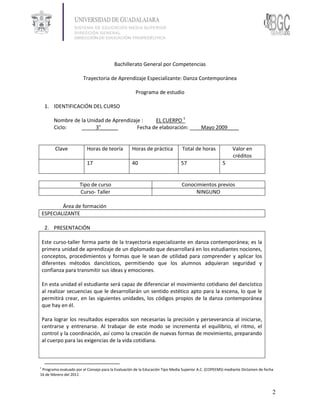 Este documento presenta el programa de estudios para la unidad de aprendizaje "El Cuerpo 1" de la trayectoria especializante en danza contemporánea. El objetivo general es que los estudiantes reconozcan el cuerpo y su posibilidad de movimiento como el elemento principal de la danza, empleando códigos básicos de la técnica contemporánea. El programa se divide en tres módulos que cubren rutinas de movimiento, valores estéticos de la danza escénica, y la relación del movimiento corporal con el sonido. La evaluación se basa