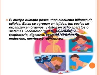 El cuerpo humano está compuesto de células agrupadas en tejidos y órganos que forman ocho sistemas principales, incluyendo el sistema respiratorio. La respiración involucra la entrada de oxígeno a las células y la salida de dióxido de carbono a través de la nariz, faringe, laringe, tráquea y bronquios. El aparato digestivo incluye el estómago, intestino delgado e intestino grueso, y está encargado de la digestión de alimentos. El apar