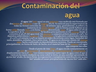 El documento habla sobre la importancia del agua. Explica que el agua es esencial para la vida y cubre el 71% de la superficie de la Tierra. También describe el ciclo del agua, incluyendo la evaporación, precipitación y transporte de vapor de agua por los vientos. Además, destaca la necesidad de proteger el agua de la contaminación.