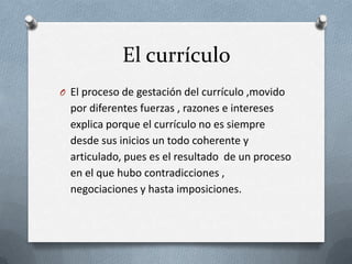 El documento discute el proceso de desarrollo del currículo escolar, el cual involucra negociaciones entre diferentes grupos y fuerzas. Propone que el currículo debe ser diseñado con la participación de la comunidad educativa y debe enfocarse en el desarrollo integral de los estudiantes más que en contenidos específicos. También sugiere que el currículo debe valorar la diversidad cultural y promover una formación ética.