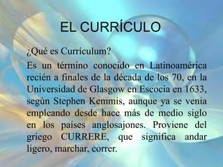 Este documento explica los fundamentos, elementos, niveles, tipos, modelos, teorías y enfoques del currículo. Define el currículo como un término que proviene del griego y se refiere al plan de estudios o programa de una institución educativa. Explora los distintos componentes que componen el currículo y las diferentes perspectivas teóricas sobre su diseño y aplicación en el sistema educativo.
