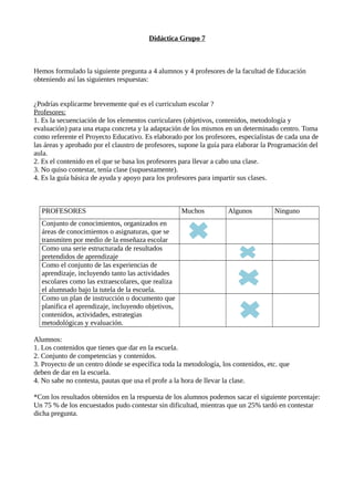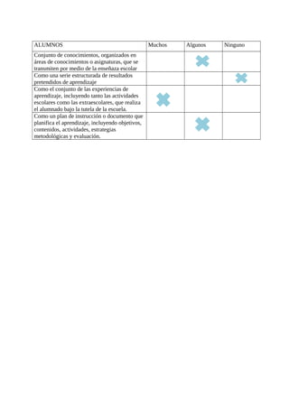 El curriculum escolar se define como la secuenciación de elementos curriculares como objetivos, contenidos, metodología y evaluación para una etapa educativa, adaptado a cada centro y aprobado por los profesores. Los profesores lo ven como una guía para impartir clases, mientras que los alumnos lo ven como los contenidos y competencias que se enseñan o como el proyecto educativo de un centro.