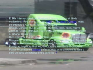 El documento describe el Día Internacional del Hombre, celebrado el 19 de noviembre en más de 60 países. Fue establecido en 1999 para abordar temas de salud masculina y resaltar las contribuciones positivas de los hombres. Sus objetivos incluyen promover la igualdad de género y modelos masculinos positivos, celebrar las contribuciones de los hombres y centrarse en su bienestar. Sin embargo, tiene menos reconocimiento que el Día Internacional de la Mujer.