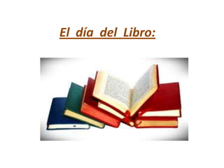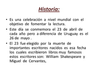 El documento habla sobre el Día del Libro, el cual se celebra el 23 de abril para fomentar la lectura. Esta fecha conmemora la muerte de William Shakespeare y Miguel de Cervantes, importantes escritores nacidos ese día. En Uruguay se celebra el 26 de mayo en honor a la apertura de la primera Biblioteca Nacional. El documento también brinda detalles sobre los tipos de obras escritas por Cervantes y Shakespeare, así como una breve historia sobre los orígenes de los libros.