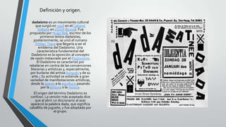 El dadaísmo fue un movimiento artístico que surgió en 1916 en Zúrich como reacción contra la Primera Guerra Mundial. Se caracterizó por oponerse a las convenciones artísticas y literarias mediante el uso de la provocación y el absurdo. Sus principales exponentes fueron Hugo Ball, Tristan Tzara y Marcel Duchamp, conocido por su parodia de la Mona Lisa con bigote.