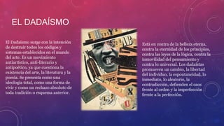 El movimiento dadaísta surgió en Zúrich durante la Primera Guerra Mundial como una protesta contra los valores establecidos y las convenciones artísticas de la época. Los dadaístas promovían el cambio, la espontaneidad y el caos a través de medios de expresión irónicos, provocativos y absurdos como collages, poesía sin sentido y manifestaciones públicas escandalosas. El objetivo era cuestionar la naturaleza misma del arte y la razón.