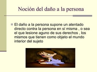 El documento explica los diferentes tipos de daños a la persona, incluyendo daños subjetivos y objetivos. Los daños subjetivos son aquellos que afectan al ser humano en sí mismo, como daños psicosomáticos, morales o a la libertad. Los daños objetivos son de naturaleza económica, como lucro cesante o daño emergente. El documento discute formas de reparar daños subjetivos no patrimoniales y resarcir daños objetivos a través de compensación monetaria.
