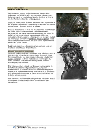 El documento describe la escultura del David de Donatello, realizada entre 1444 y 1446. Representa al joven pastor David descansando después de vencer a Goliat, y fue una de las primeras esculturas del Renacimiento en mostrar un desnudo masculino a tamaño natural. La escultura también simbolizaba la victoria de Florencia sobre Milán. Donatello estudió la anatomía humana directamente de modelos vivos, influenciando enormemente a los escultores posteriores del Renacimiento.