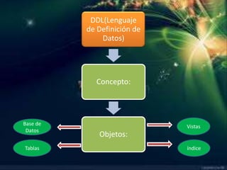 El documento describe el lenguaje de definición de datos (DDL), que se utiliza para crear y modificar objetos de base de datos como tablas e índices. El DDL incluye sentencias como Create, Alter y Drop. También cubre el lenguaje de consulta estructurada SQL y sus funciones como funciones de conjunto, funciones de agregado y funciones escalares.