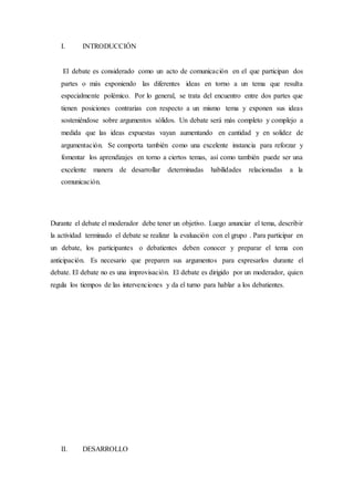 Este documento describe el debate como un acto de comunicación en el que dos o más partes exponen ideas contrarias sobre un tema polémico, regulado por un moderador. Define el debate como una discusión pública donde se expresan y argumentan ideas con el objetivo de convencer a los demás. Finalmente, concluye que el debate en el aula fomenta el aprendizaje, el respeto, la participación y habilidades útiles para la vida.