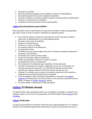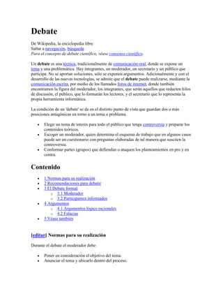 El documento describe un debate como una técnica de comunicación oral o escrita donde se expone un tema controvertido sin aportar soluciones, sino argumentos a favor y en contra. Incluye integrantes, un moderador que controla el tiempo de intervención, y un público. Explica normas como escuchar al otro, ser breve y tolerante, y tratar de llegar a conclusiones. También define conceptos como argumentos lógicos, falacias, y el rol del moderador en guiar el debate de forma ordenada y respetuosa.