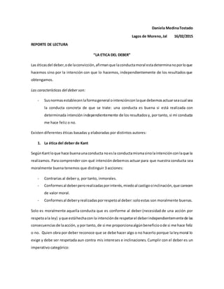 El documento resume diferentes teorías éticas del deber, incluyendo las de Kant, Nietzsche, Sartre y Habermas. La ética de Kant se basa en actuar conforme al deber y respetar la ley moral, independientemente de las consecuencias. Nietzsche propuso una "transmutación de valores" para reemplazar la moralidad débil por la fuerza y el poder. La ética existencial de Sartre enfatiza la libertad humana y rechaza la mala fe. Finalmente, la ética comunicativa de Habermas busca alcan