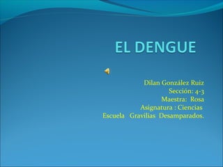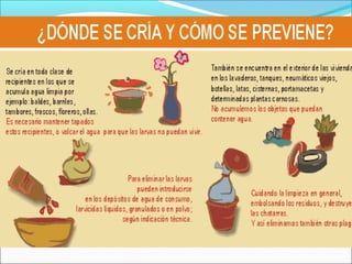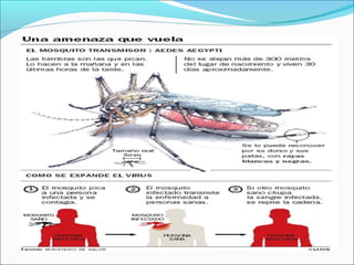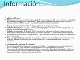 Este documento proporciona información sobre el dengue, una enfermedad viral transmitida por mosquitos que causa fiebre y hemorragias. Explica que el dengue es causado por el virus del mismo nombre y transmitido por el mosquito Aedes aegypti. Describe los síntomas de la fiebre de dengue y la fiebre hemorrágica de dengue, la cual puede ser mortal. También detalla medidas para prevenir las picaduras de mosquitos y la propagación de la enfermedad.