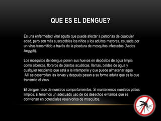 El documento proporciona información sobre el dengue, una enfermedad viral transmitida por mosquitos que causa fiebre y dolor. Explica los síntomas del dengue, cómo se transmite, recomendaciones para prevenirlo eliminando depósitos de agua donde se crían los mosquitos, y la importancia de buscar atención médica inmediata para quienes presentan los síntomas.