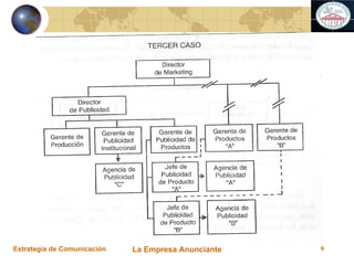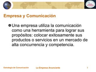 El documento habla sobre la estrategia de comunicación de una empresa anunciante. Explica que una empresa necesita un departamento de publicidad para analizar, ejecutar y controlar sus acciones de comunicación de manera eficiente y coherente. También describe cómo determinar el presupuesto publicitario y los costos asociados, así como los métodos para seleccionar una agencia de publicidad y establecer las relaciones entre la empresa y la agencia.