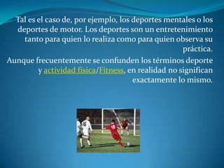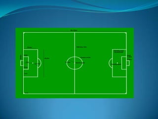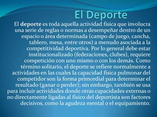 El documento define el deporte como una actividad física que involucra reglas y competencia, ya sea individual o en equipo. Explica que aunque el deporte generalmente implica capacidad física, también pueden ser factores la habilidad mental o el equipamiento. Además, provee entretenimiento tanto para los participantes como los espectadores. Luego, procede a detallar las reglas básicas del fútbol, incluyendo el tamaño y marcado del campo, las áreas de gol y portero, los postes y redes de la portería