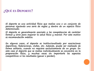 El documento define el deporte como una actividad física que sigue reglas y se practica en un espacio determinado, generalmente de forma competitiva. El deporte mejora la salud física y mental y puede ser individual o en equipo. A lo largo de la historia se han practicado diversos tipos de deportes que actualmente son importantes para el desarrollo y bienestar de las personas.