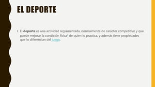 El documento resume la historia, evolución y aspectos clave del deporte. Explica que los chinos ya practicaban deportes hace 4000 años y que los egipcios regulaban actividades como la natación. Señala que el deporte se ha profesionalizado debido a los medios de comunicación y el tiempo libre, aunque esto ha generado polémica. También destaca las conexiones entre deporte y arte, el papel de la tecnología en nutrición, lesiones e investigación, y la gran influencia del deporte en la sociedad y cultura.