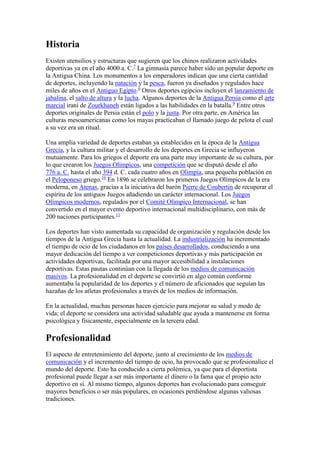 El documento define el deporte como una actividad física reglamentada y competitiva que mejora la condición física y psicológica. Explica que el deporte ha evolucionado desde la antigüedad hasta la actualidad, donde es una industria profesionalizada que mueve grandes cantidades de dinero y tiene un importante impacto social y económico positivo. También señala que la tecnología ha mejorado el rendimiento deportivo y la salud de los atletas.