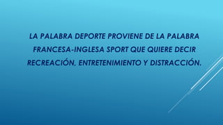 El documento define el deporte como conjuntos de ejercicios físicos practicados bajo reglas, ya sea de forma individual o colectiva, donde prevalece la competencia y el respeto mutuo. Explica que los deportes se desarrollaron en civilizaciones antiguas como China, Egipto, Grecia y Roma, y que pueden clasificarse en deportes individuales, de conjunto y profesionales vs. aficionados. Resalta los beneficios del deporte para la salud física y mental de las personas, y su importancia para la sociedad al contribuir a